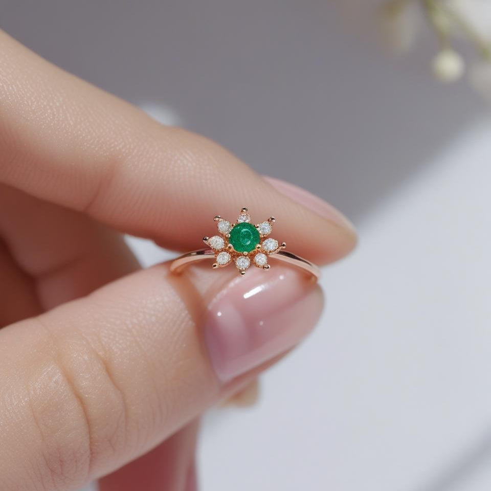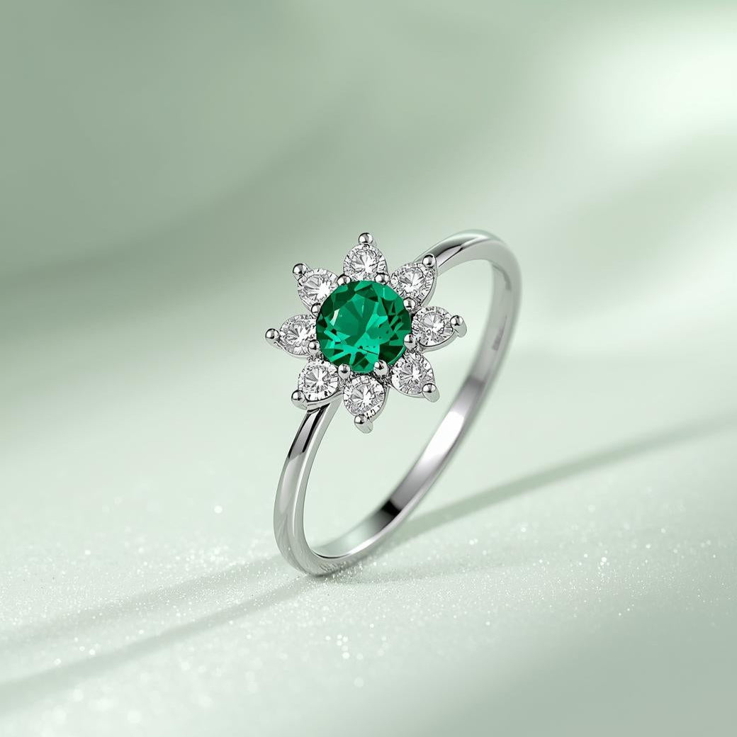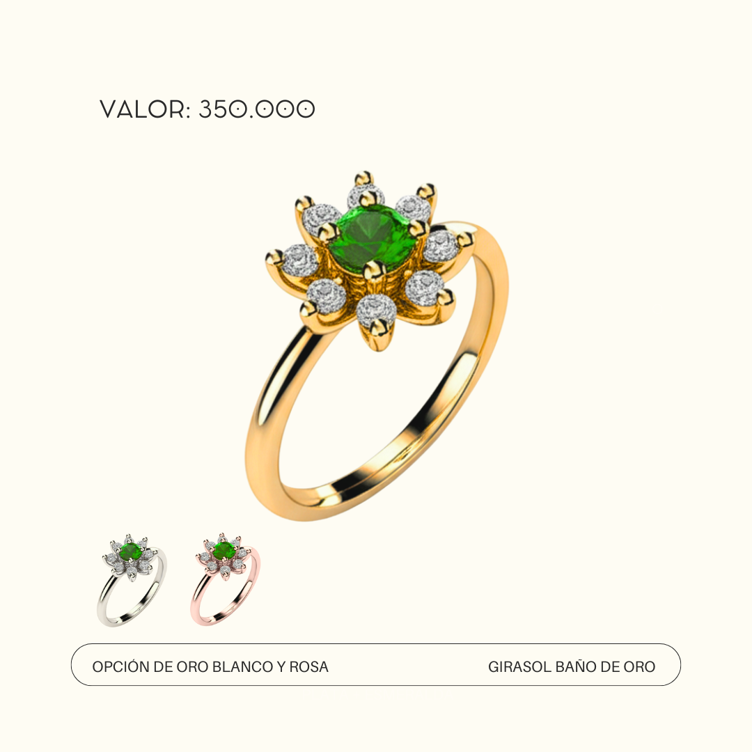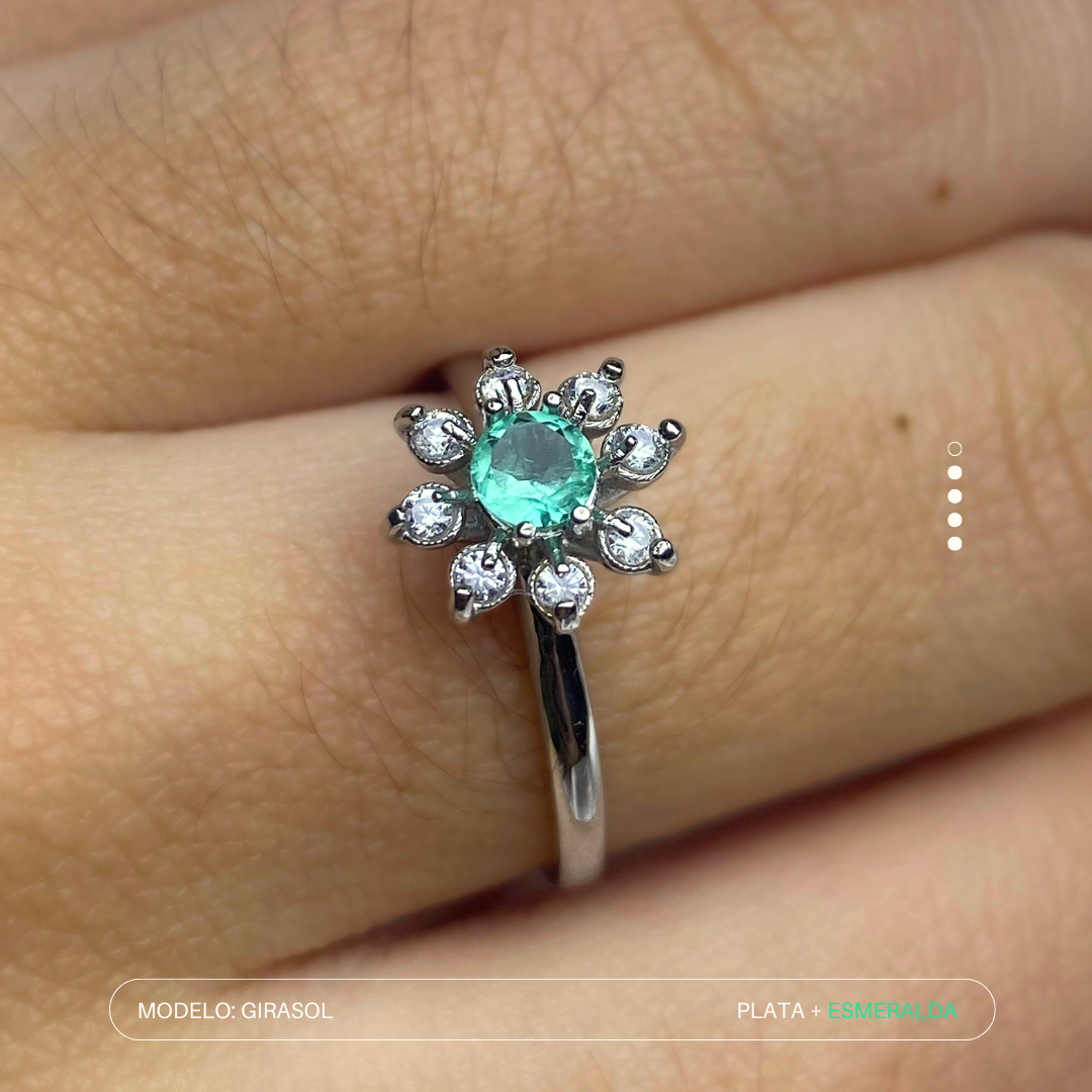 Anillo en plata ley 950, con esmeralda natural, alrededor 6 circones de alto brillo dando la forma de los pétalos de un girasol, diseño único de Preciato. - 3 días hábiles de fabricación - envíos a todo Colombia - todas las tallas disponibles.
